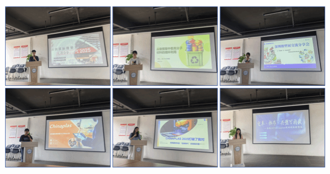 随后,6位同学一一分享了他们观展的所感所悟。陈镇炜同学从本学期《材料添加剂化学》、《高分子材料成型加工》两门专业课的角度出发,认为通过观展实现了从课本知识到理论实践的升华;刘倩晴同学从塑料分拣、PCR塑料的多元应用等方面介绍了高分子材料的循环利用,展现了高分子材料在可持续发展中的关键作用;黄俊媚同学以洞洞鞋、塑料瓶等常见生活用品为例,介绍了EVA、PPT等我们身边高分子材料的“黑科技”,让高深理论回归生活温度;林旭光同学介绍了他参观的塑料类、添加剂、加工成型设备等展区,并分享了他对专业就业前景与职业规划的感想;丘甜恬同学介绍了展会上生物基材料的创新案例,认为观展的经历打破了她对生物基材料“低端替代”的刻板印象,启发大家以开放心态拥抱技术革新;冯嘉琪同学介绍了几家她所关注的知名橡塑公司,以及她在展会上所见到的创新产品,展现了高分子材料领域的蓬勃活力与无限潜力。