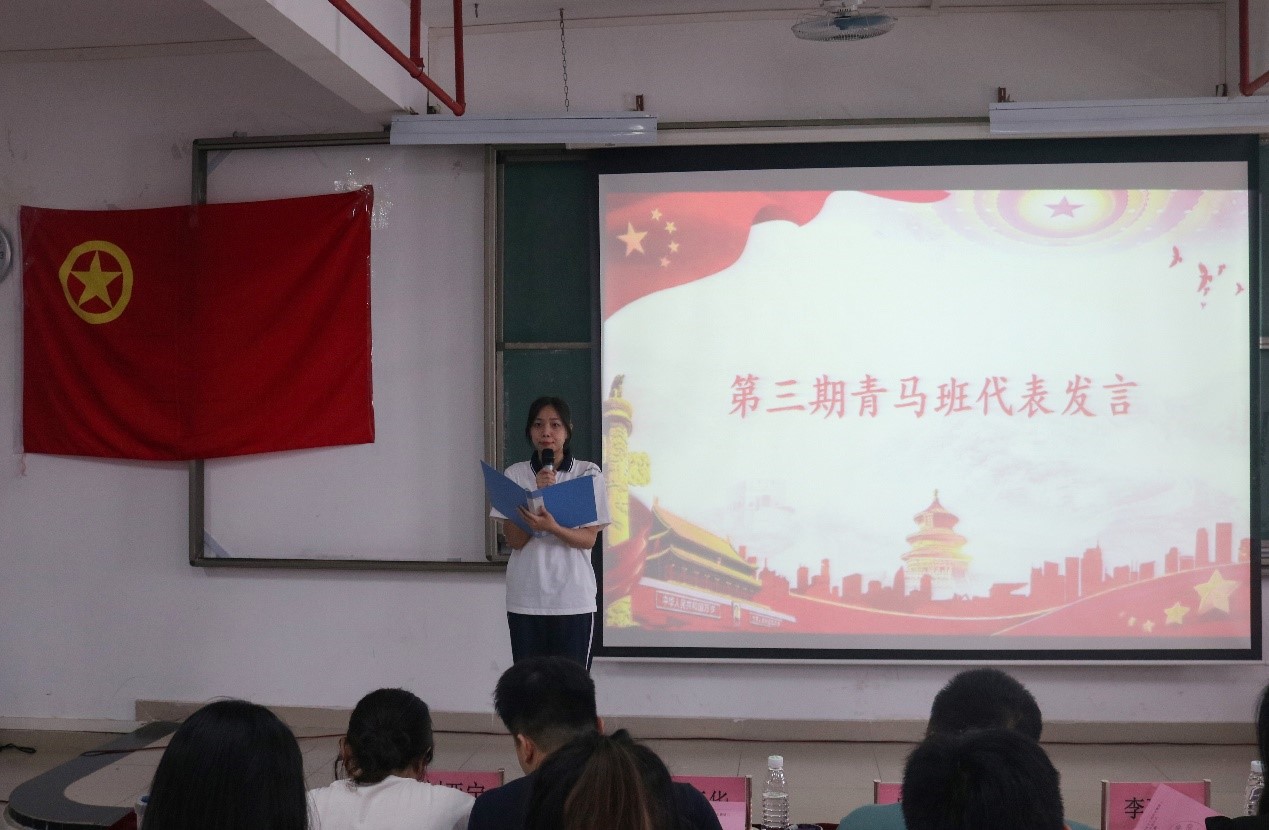 第三期青马班学员代表黄泽慧引用邓小平同志“实践是检验真理的唯一标准”,表明在今后的学习中应将理论联系实际,通过青马班的平台,积极参加实践活动,开拓眼界,磨练意志和耐力,做有理想、有追求的青年。