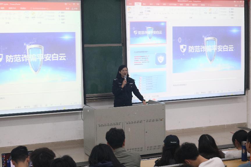 宣讲专员告诫同学们慎防网络电信诈骗,切勿轻信低投入高回报的骗局,在受到他人胁迫时要勇于拆穿骗子的把戏。同时,张警官用真实的案例揭穿了交友诈骗和购物诈骗的伎俩,详细地讲述受害人上当受骗的全过程,提醒同学们需保持警惕,谨防上当。加强金融知识学习,提高风险防范意识和能力。