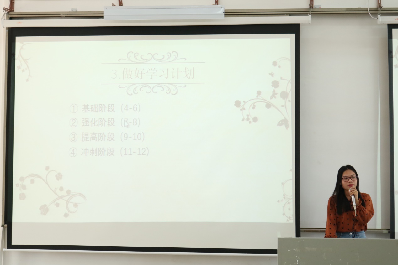 随后,第二位分享考研经验的黄培锦上台发言,让尚在考研之路的同学们明白了考研路漫漫,唯有坚定坚持,方得始终。紧接其后,陈影、潘丽娟相继上台,从各个不同角度阐述了考研的艰辛与不易,所谓“求其上者得中者”,唯有明确目标努力前行,梦想才有可能开花结果。