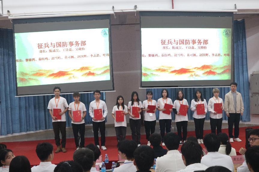 团委学生副书记团成员林晓彤为办公室部长杨小媚、颜秀仪、区镇麒、钟坤明,征兵与国防事务部部长陈成昊、王诗蕊、吴晓怡颁发聘书。