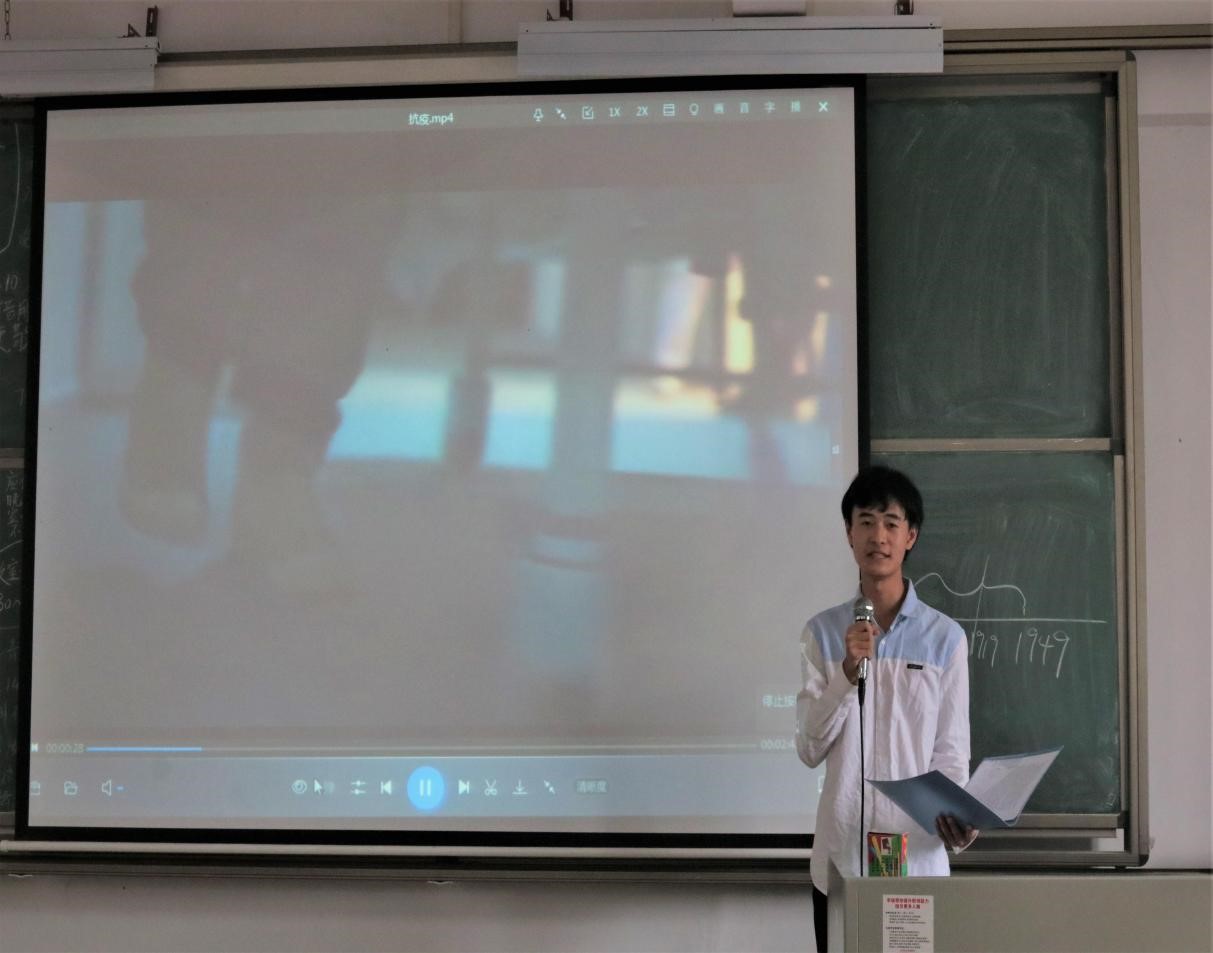 宣讲员刘浩贤声文并茂,从青年角度阐述忠于祖国、服务人民、勇于担当的“抗疫精神”。字字铿锵的他让同学们深刻感受到每位党员“仁者爱人,兼济天下,民族复兴”的理想。而宣讲人邹榕则以崭新的方式——音乐讲述党史。通过最初的《国民革命歌》到改编的《土地革命歌》,再到后来改编成童谣的《两只老虎》,一首革命歌曲在历史上的改变让同学们体会到在不同时代中革命先辈们拼命努力的身影。