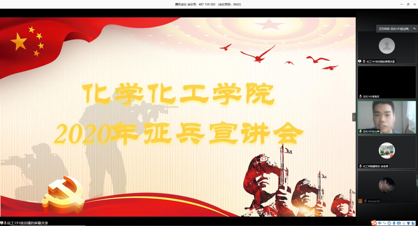 “携笔从戎报效祖国,优秀青年立志从军”一句话激起了无数青年报效祖国的热血,引起青年对军旅生活的向往。为了鼓励青少年入伍磨练自己,树立正确的世界观、人生观、价值观和择业观,6月2日下午,化学Beat365官方网站在腾讯会议召开了2020年征兵宣讲会。化学Beat365官方网站党委书记邱树华,化学Beat365官方网站辅导员徐冠东,原教导大队队长许义锋,原预备役分队队长吴迪煜,现教导大队副队长杜心祥,19级化工院教导大队队员和各班级代表参加了本次会议。