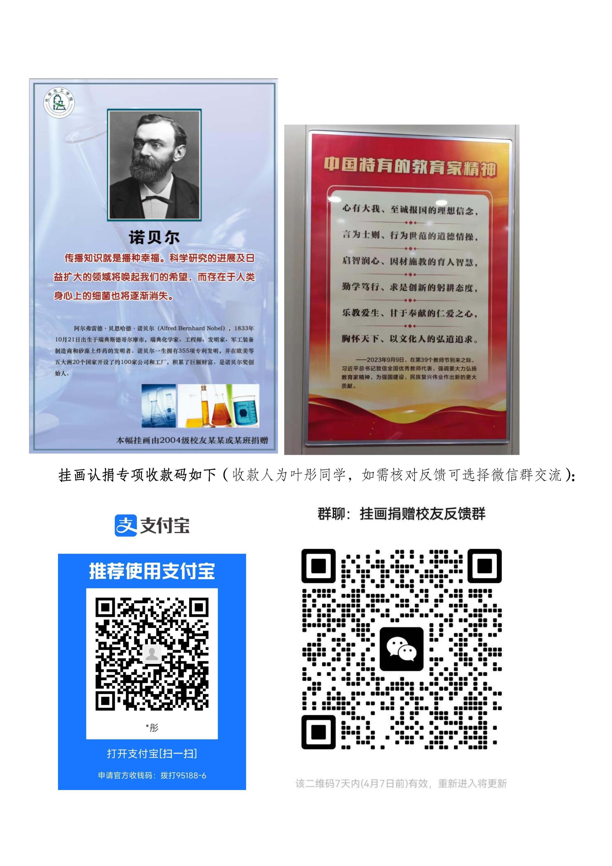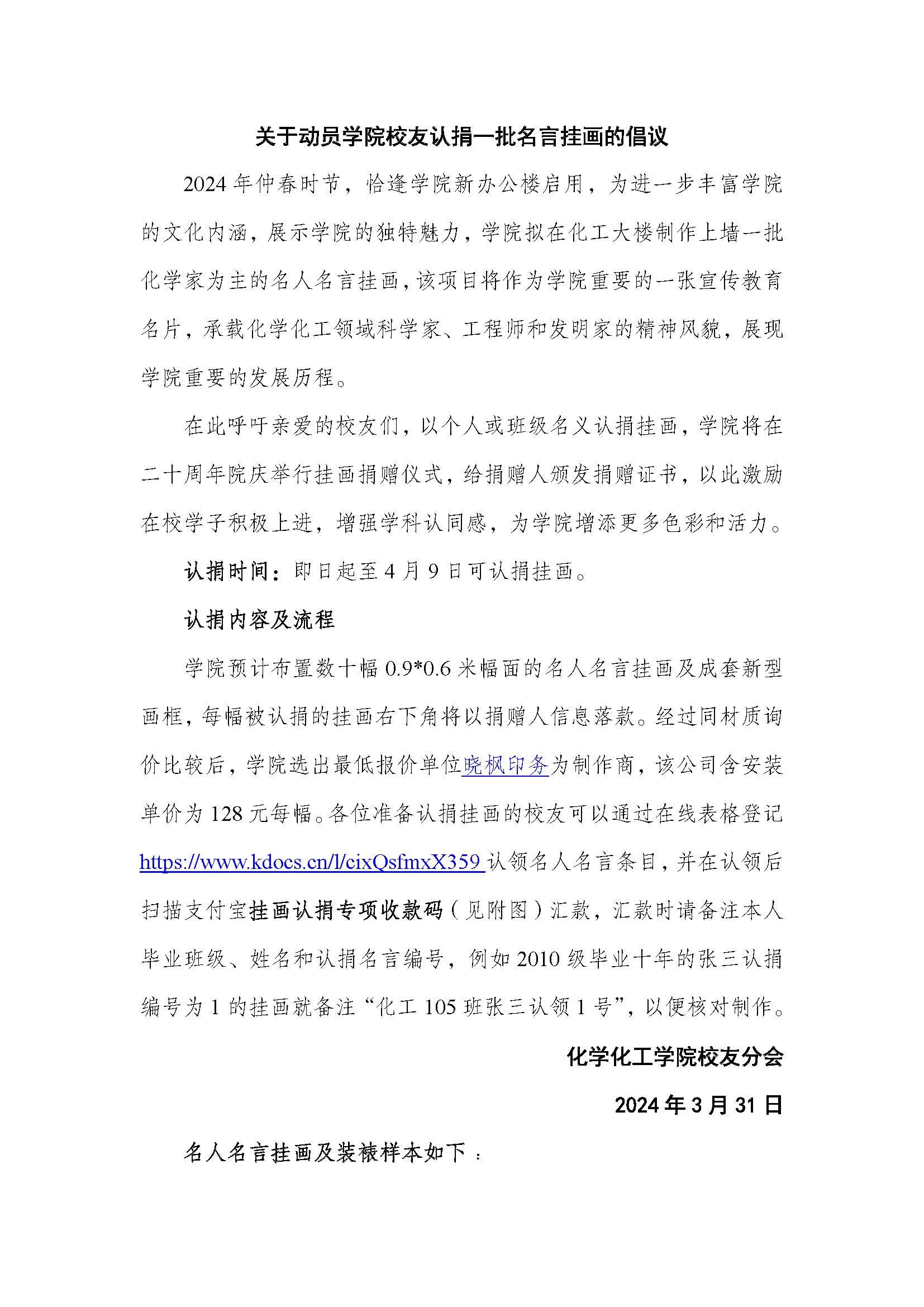关于动员学院校友认捐一批名言挂画的倡议