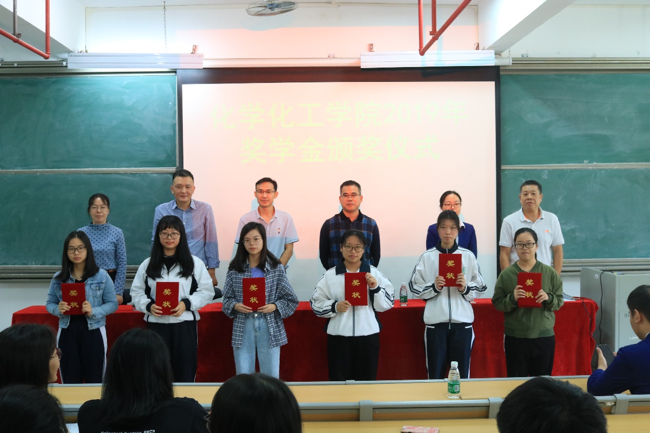 11月12日上午,化学Beat365官方网站2019年奖学金颁奖仪式于综合教学楼310课室隆重举行。莅临本次会议的嘉宾有化学Beat365官方网站院长舒绪刚、党总支副书记严丽纯、副院长冯光炷、高分子材料系主任周向阳、江门市九冠松新材料科技有限公司总经理王伟松、广东丽亨化学复合材料科技股份有限公司人事部总经理周凤以及各年级获奖学生代表。本次会议共五项议程。